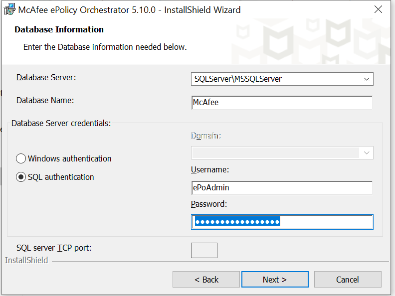 The Database Information step will require the server and database names, as well as an authentication method.