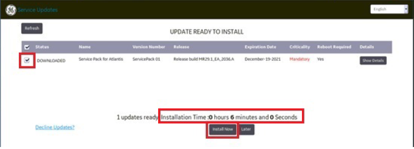 Procedure When the notification icon indicates 100% completion of download progress, reboot the system and log on to MR Application. Power up the system and log on. If a software patch is available for installation, the UPDATE READY TO INSTALL screen displays.