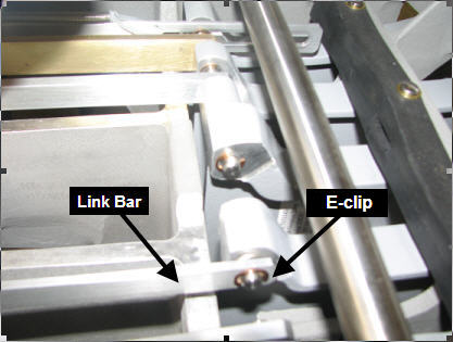 7. Before removing the lever, locate and remove the e-clip that holds the link bar to the pedal at the rear of the table with a small screwdriver.