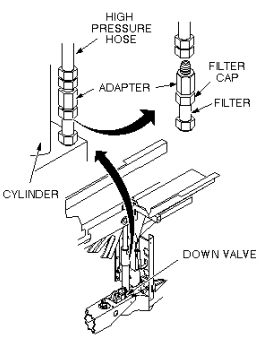 - Remove the high-pressure hose from the adapter. A small amount of oil will spill out of the hose during removal; raise the hose as high as possible to limit oil spillage.