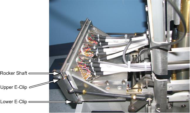 - Remove the e-clip from the bottom of each rocker shaft that holds the rocker clamp in place. If desired, remove the e-clip from the upper part of the rocker shaft above the rocker clamp.