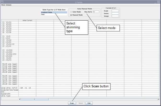 By default, Gradshim is performed in auto mode, though manual mode is also available. - Select the shim type (gradient, or test) and Manual Mode, then click Scan.