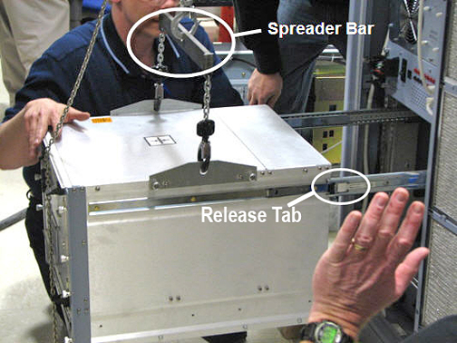 Because of its weight, removing the SRPS from the PEN cabinet requires you to use the hoist service tool. The hoist service tool allows one person to perform this procedure. This is the preferred method to avoid injury.
