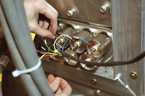 - Allow five minutes for the filters to discharge. After five minutes, check capacitors for discharge with grounded cable on DVM.