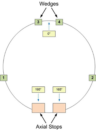 20. Install the wedges (with one G10 washer and one brass M10 x 35 mm hex head bolt per wedge) on the patient end of the magnet flange in the order shown for the applicable 10- or 4-wedge system. (See Figure 15 or Figure 16.)
