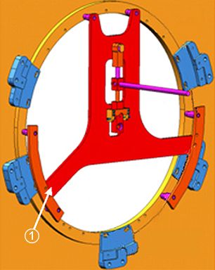 2. Attach the two axial stops (1) to the patient end magnet flange with two M10 x 24 mm washers and two silicon-brass M10 x 30 mm hex head bolts per stop.