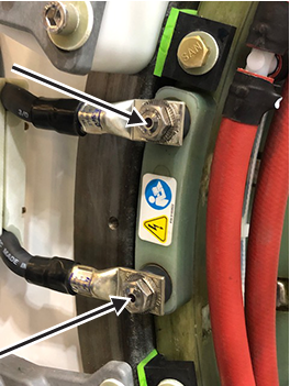 2. Remove and discard the six flanged M10 nuts and Nord-Lock washers securing the busbar lugs to the gradient coil, and slide the busbar terminal lugs off the coil studs.