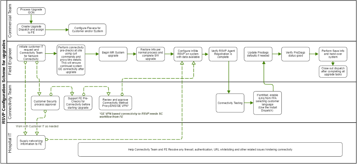 The workflow shown below is a tentative representation of the connectivity process for MR system upgrades. Please follow your regional connectivity process as laid out by the connectivity team.