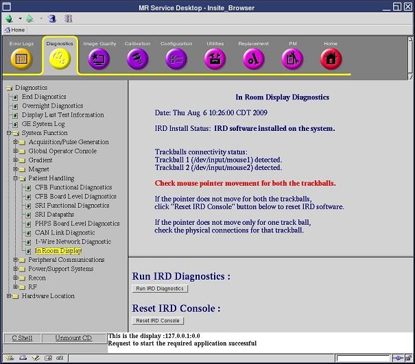 This diagnostic determines if the trackballs are detected by the host PC and obtains status information on the connectivity of the trackball devices. It provides a mechanism to restart only the In Room Display (IRD) without restarting the host PC. If the Patient Handling Power Supply (PHPS) loses power, a replacement of the IRD console/trackball/IRD interface box, or re-connection of USB/DVI-D/fiber optic cables may cause the trackballs to lose connectivity.