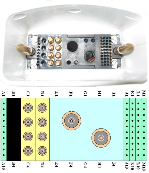 Before removing the cable assembly from the coil, visually inspect all coaxial connectors and pins on the coil connector. Figure 2 shows the pin layouts of the system side coil connector. The connector of the CTL coil has 2 pins in column A, 8 pins in column J, 7 pins in column M, 4 RF coaxial connectors in column C, and 4 RF coaxial connectors in column D. If there are any broken, deformed or recessed pins or coaxial connectors, perform Cable Replacement.