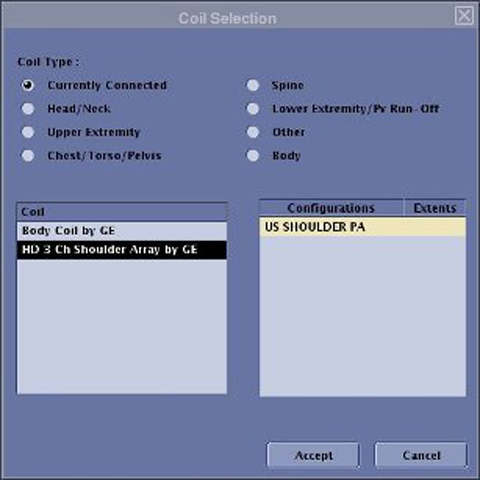 Verify the system has correctly detected the coil by selecting Currently Connected on the Coil Selection screen (example shown below) to display the coil(s) prescribed.