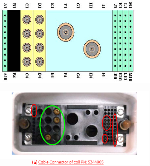 Before removing the cable assembly from the coil, visually inspect all coaxial connectors and pins on the coil Cable Connector.