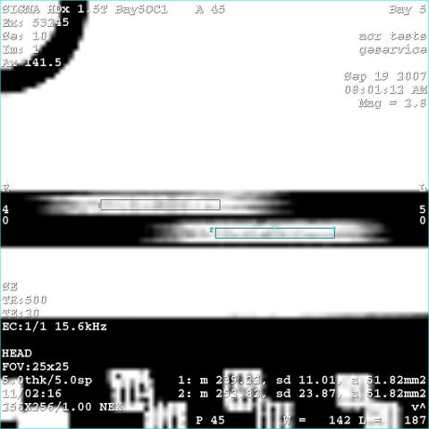 The ACR phantom scanning instructions specify using Graphic Rx when prescribing the 11 slices on the ACR sagittal localizer image. The pixel dimension in the sagittal localizer is 0.976 mm2. The Graphic Rx screen uses slightly less than a quarter of the screen to display the sagittal localizer image when graphically prescribing the slices. Very small movements of 1 pixel on the graphic Rx lines correlate to almost a millimeter of slice location placement. Small slice location errors can be induced if the Graphic Rx lines are not placed perfectly over the sagittal localizer. Using the manual slice location prescription method described in Slice Position Accuracy sometimes provides better slice position accuracy.