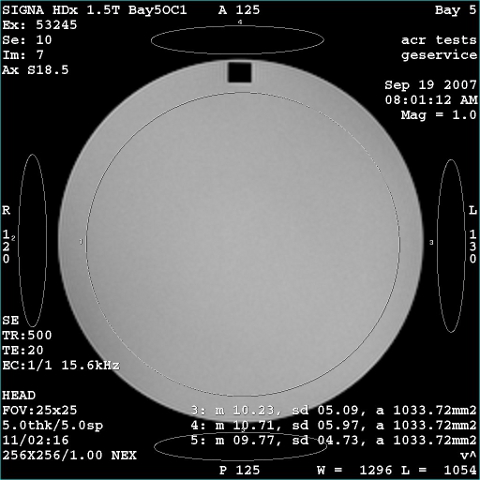 The image intensity uniformity test measures the uniformity of the image intensity over a large water-only region of the phantom lying near the middle of the imaged volume and thus near the middle of the head coil.