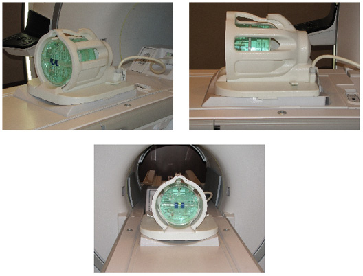 Place the chosen head-type coil onto the patient cradle, into its normal clinical imaging position, and plug it in. Align, clamp, fasten, etc. the coil using only those method(s) used to place it for routine clinical imaging. Make sure the coil is not off center or rotated from its normal correct position.