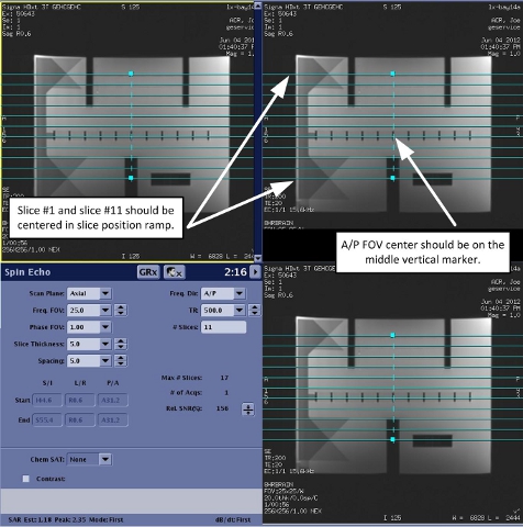 Taking time to properly position the phantom reduces the time needed to perform these procedures. Setup is an iterative process, with phantom repositioning between each scan, repeated as many times as necessary to center the phantom in all three planes.