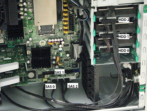 The SAS 0 output must connect to HDD O (lower) hard drive. This drive contains the application software.