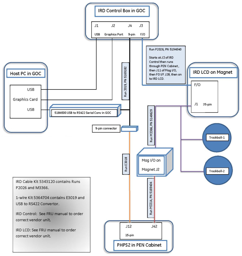 Inside the magnet room, data from the operator control panel (enclosure trackball) is routed by USB to the IRD monitor where it is converted to fiber light signals and sent over the dual fiber optic cable to the IRDC module. The IRDC module converts the trackball signals and sends them to the USB connection on the host PC.