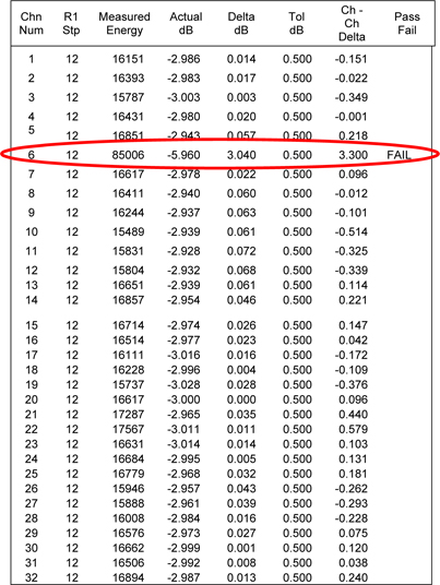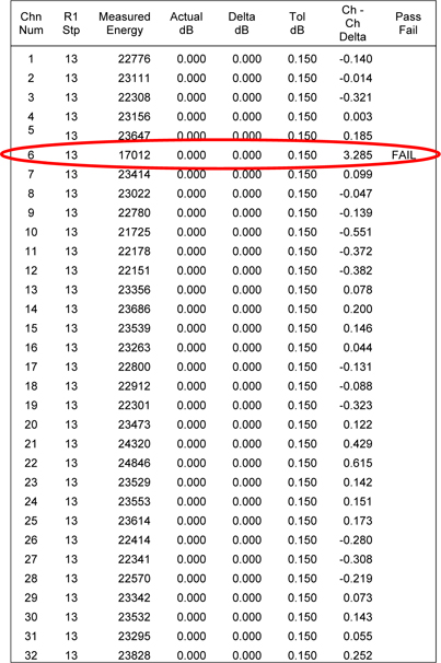 For each R1 value, for each channel, the measured energy drops by 3db ± 0.5db. If a channel falls outside the tolerance, the pass/fail column will indicate fail for that channel. No entry indicates pass.