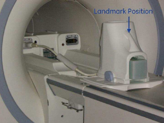 - Establish the landmark on the top of the coil as shown and Advance to Scan.