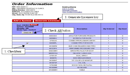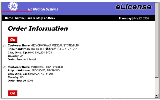 - It is possible that the order number is not unique to your customer. If this is the case, a list of all matching sites displays on the Site Selection screen shown below. Select the desired system and click Go to display the order. If the order number is unique, eLicense automatically brings up the order and displays the Order Information screen. Verify that the Customer Information at the top left of the screen is the correct customer.