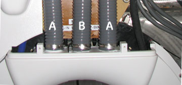 A RF cooling air hose B Patient air hose To distinguish the patient air hose from the RF cooling air hose, use the front control panel to turn off the patient air hose. After the fan is off for patient air flow, there is air flow only through the RF cooling hoses.