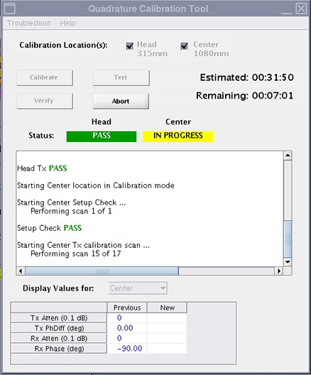 The tool does a set-up check before scanning begins to make sure the sphere is in the correct position. The text in the Quadrature Calibration Tool window tells you to adjust the sphere, if necessary. After the tool verifies the correct position of the sphere, the system starts the calibration scans. The tool window shows the status of the scans. When the head scans pass, the Place Phantom dialog box shows.