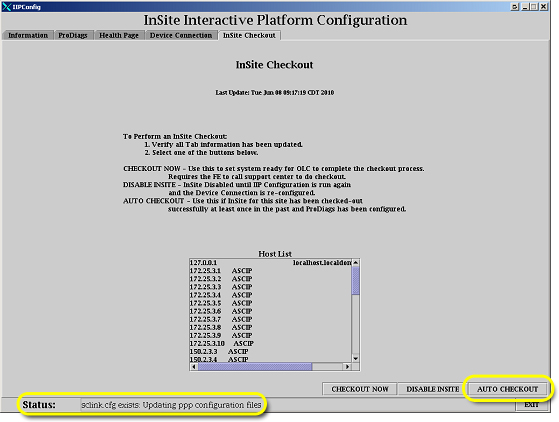 - Allow the system to run until the box disappears.When AUTO CHECKOUT is complete, the status bar displays the message InSite Dial out check completed successfully.