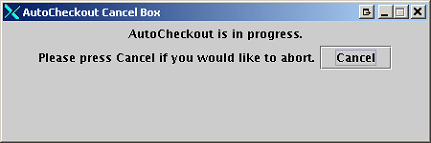 The status bar indicates the status of the verification process. An Auto Checkout Cancel dialogue displays while the process is running.Figure 2. Auto checkout cancel box