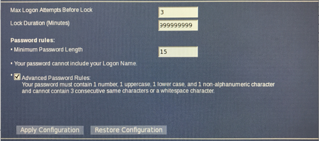 - Click Apply Configuration.note: The following password restrictions should be followed but the FE should defer to site-specific password requirements.