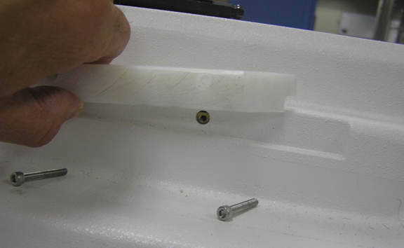 Two guide rails (LH and RH) are used to guide the cradle when moving the cradle forward and backward on the table top. Fives screws secure each guide rail to the table top. Each screw mounts through the guide rail and table top to the nut bar. The nut bar is NOT secured to the table top.