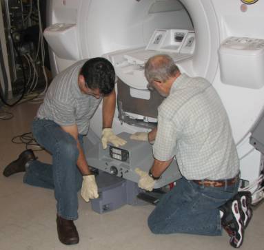 - When the distance between the dock and the magnet is at least equivalent to the distance between the magnet and where the foot of the patient table would normally be located, both field engineers may slowly lift the dock from the floor and exit the room.