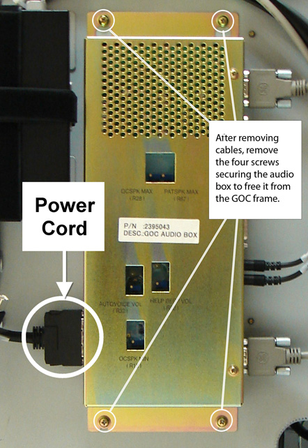 - Remove the four screws securing the audio box and remove it from the GOC frame.