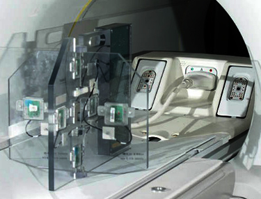 2. Connect the Hypertronics cable to the T/R board and secure with screws. Place the fixture at the front (head coil end) of the table with the connection box toward the bore.