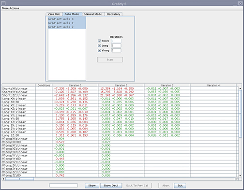 Grafidy 3 adjusts and compensates short, long, and very long time constant eddy currents for both linear and B0 terms. Use the Grafidy 3 procedure to perform eddy current compensation. Grafidy 3 should be run in Auto mode first. If Auto mode fails to bring any of the terms into specification, Manual mode and Oscillatory mode can be used.