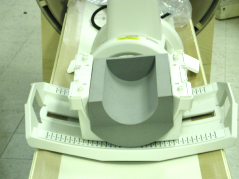 - Remove all other surface coils, and place the Quad Extremity Coil on the patient table without any pads. (The coil should be positioned such that its cables exit toward the magnet.) Set the phantom positioner into the coil as shown.