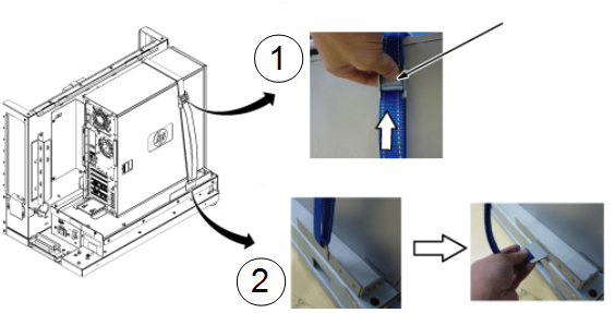 Item Description 1 Press release lever of buckle and loosen strap. 2 Remove the hook. - Remove the host computer from the GOC.