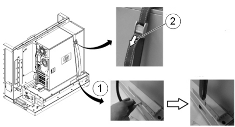 Item Description 1 Insert the strap hook into the bracket. 2 Pull the strap in the direction of the arrow and tighten. - Restore all cables to the computer.