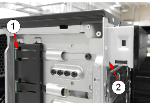 Item Description 1 Plastic lock 2 DVD drive being removed - Remove the guide screws from the old DVD drive and install them on the new unit.