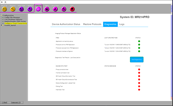 The Diagnostics tab allows you to check the status of the Imaging Protocol Manager application.