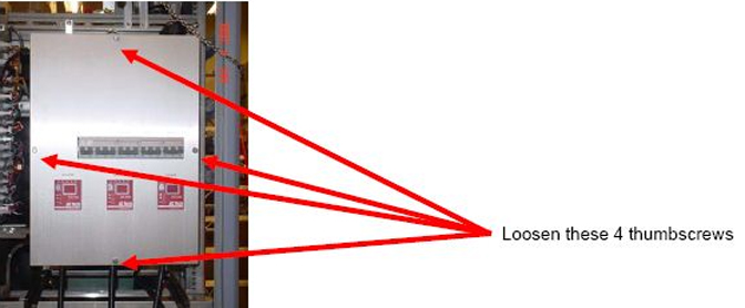 - Make sure all energy is dissipated. Carefully remove the four thumbscrews securing the HEC power box front cover and remove the cover.
