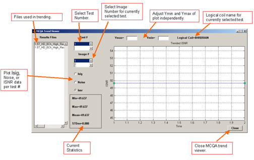 Every time a MCQA test is completed, a new results file is generated. Past MCQA results are stored on the system, which allows for trending of ISNR data over time. These results can be graphically trended using the MCQA Trend Viewer. All the files available for trending are listed in the Results Files window at the left.