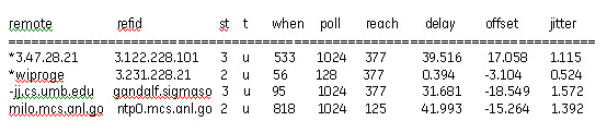 The output displays a list of time servers and the delay, offset and jitter that each server is experiencing. The delay and offset values of the NTP server you just synchronized should be non-zero and the jitter value should be under 100.