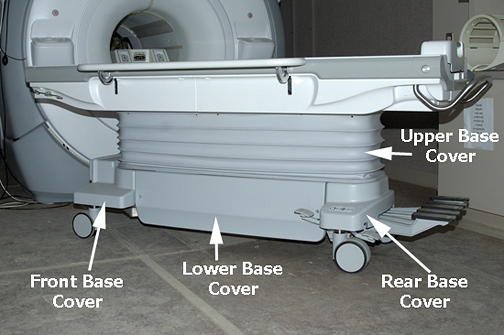The Upper Bellows, an accordion style cover, can be positioned up or down depending on the type of servicing needed. The Lower Base Side Cover is a solid single cover that runs the length of the lower chassis from the front caster assembly to the rear caster assembly on each side.