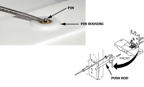 - note: Pressing the actuating button engages the secondary cradle latch cable and causes the pin stop to move down flush with the table top surface, allowing the cradle to slide forward.Manually slide the cradle forward and prop up the cradle to expose the pin housing and push rod. See Removing Cradle Assembly.