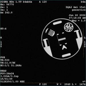 If the axial (coronal) image does not look like the axial (coronal) image example in this section, a gradient wiring/setup problem exists. See Troubleshooting the Daily Quality Assurance (DQA) II tool.