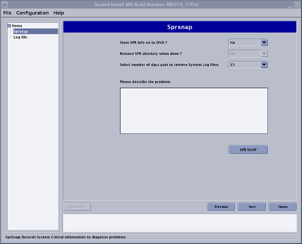 - If a message pop-up of “There is an existing sprsnap in progress, please wait and try later.” It indicates another instance of sprsnap running, you can wait until current one completes them click SPR SNAP again, or wait and collect new generated snap under /export/home/snap.