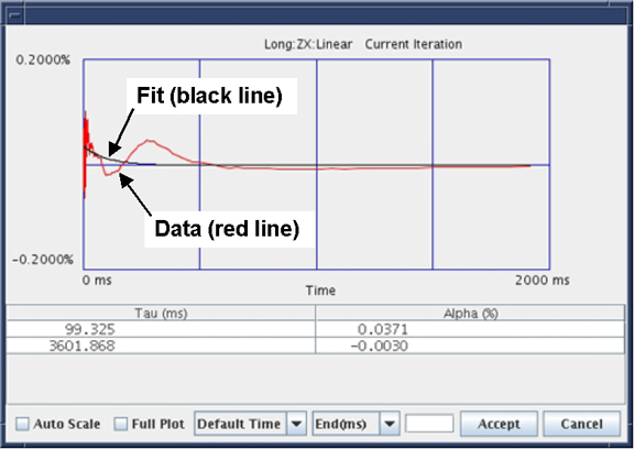 note: This leaves the last accepted values in the calibration files. Do not expect any improvement on future scans when the fit does not match the data, even if the Cal parameters are accepted.Figure 2. Results window with accept/cancel buttons
