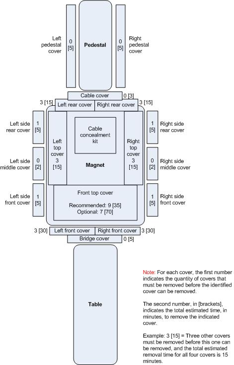 For some of the Side and Top Covers, other covers must be removed first. This diagram shows the names of the GEM-style covers, which covers can be removed individually and which need other covers removed first, and the estimated removal time for each cover. Installation time is estimated to be the same as the removal time.