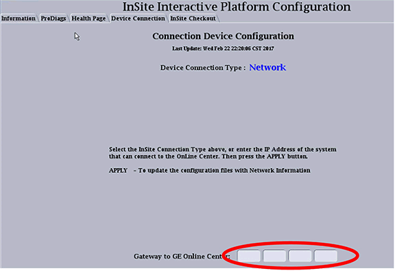 - Enter the Gateway IP address as provided by the customer in the Gateway to GE Online Center field.